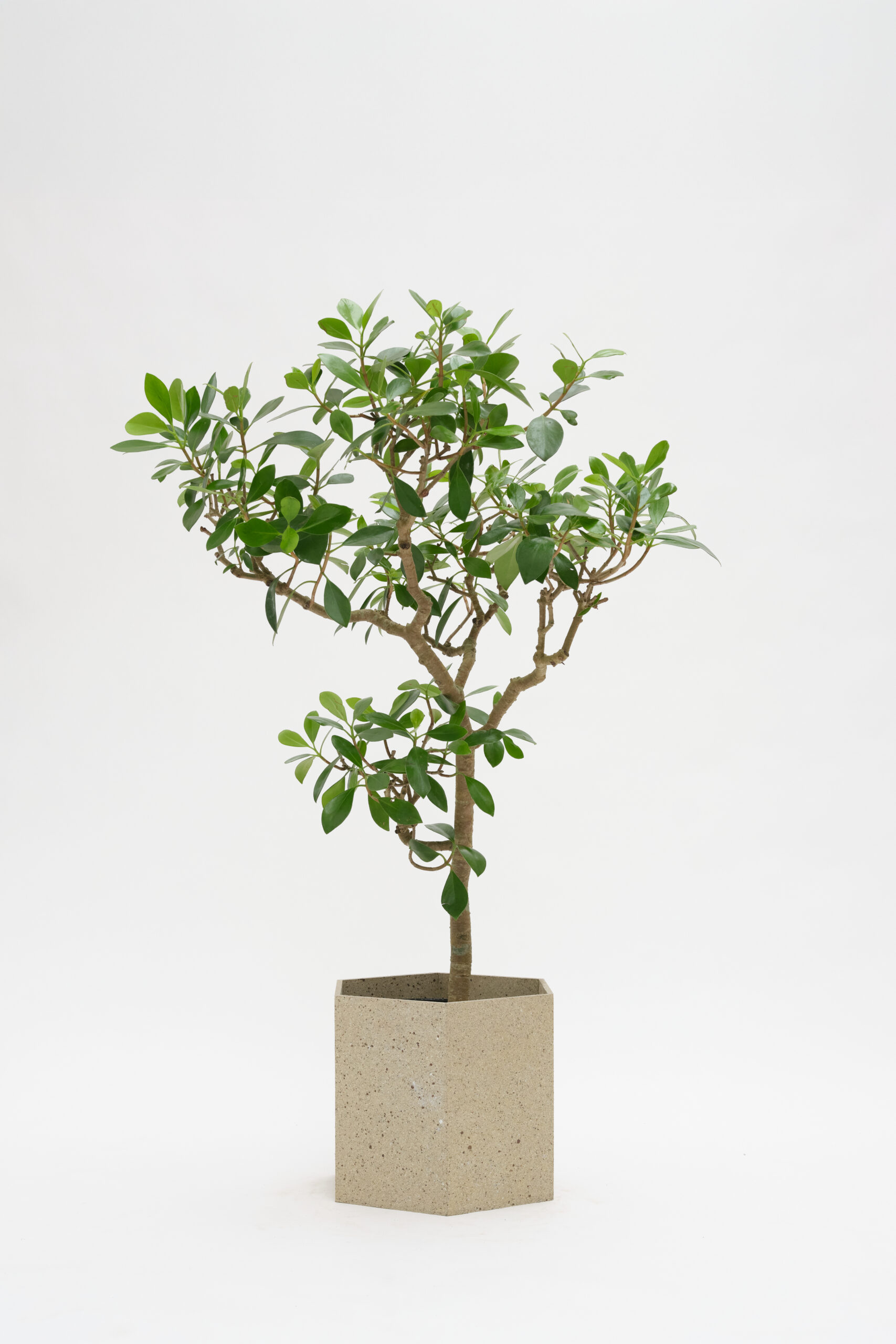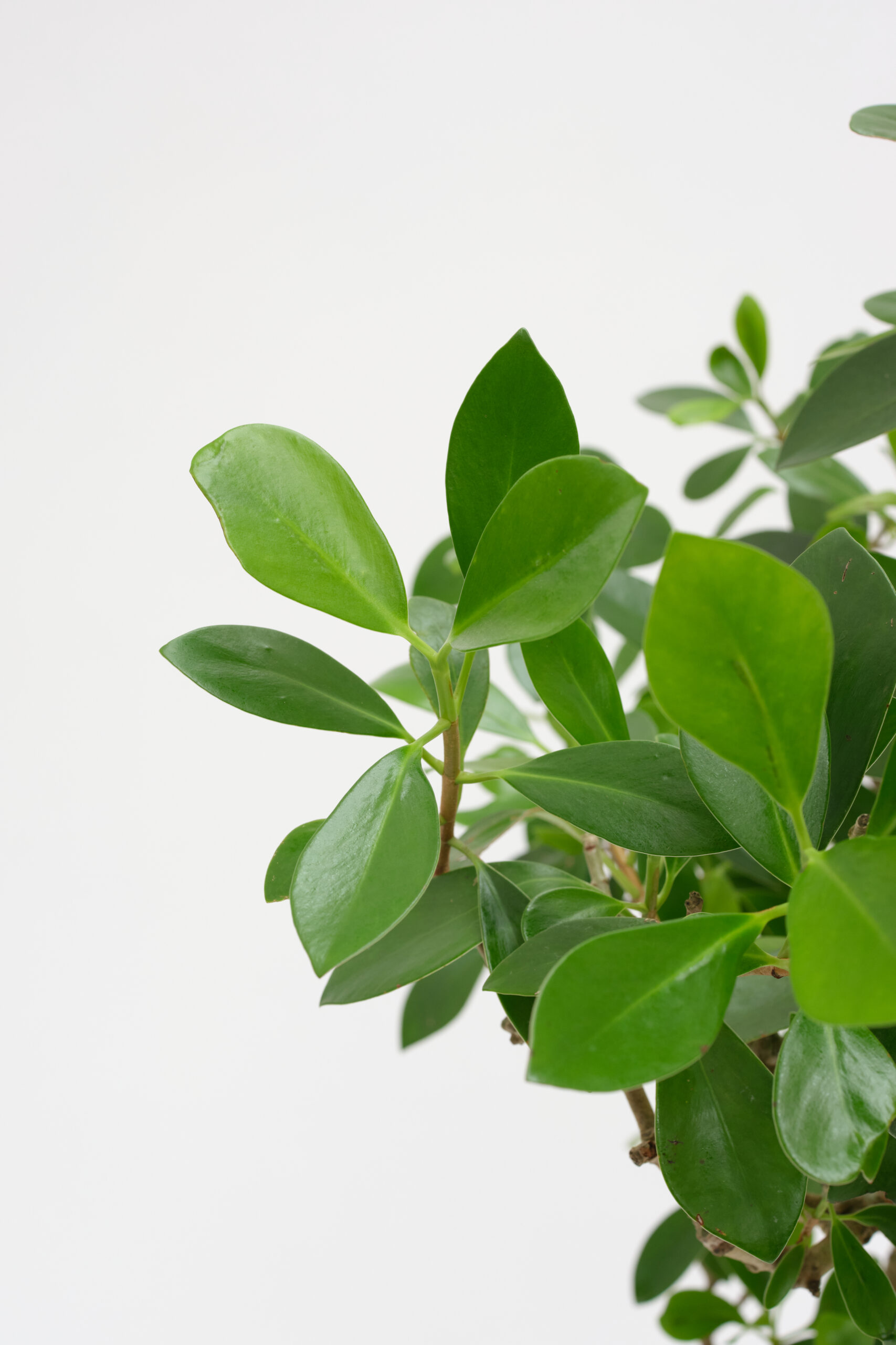 丸みを帯びた肉厚で光沢のある葉が特徴的な植物です。成熟すると、幹や枝から気根を伸ばし、樹木らしい力強い姿に生長します。