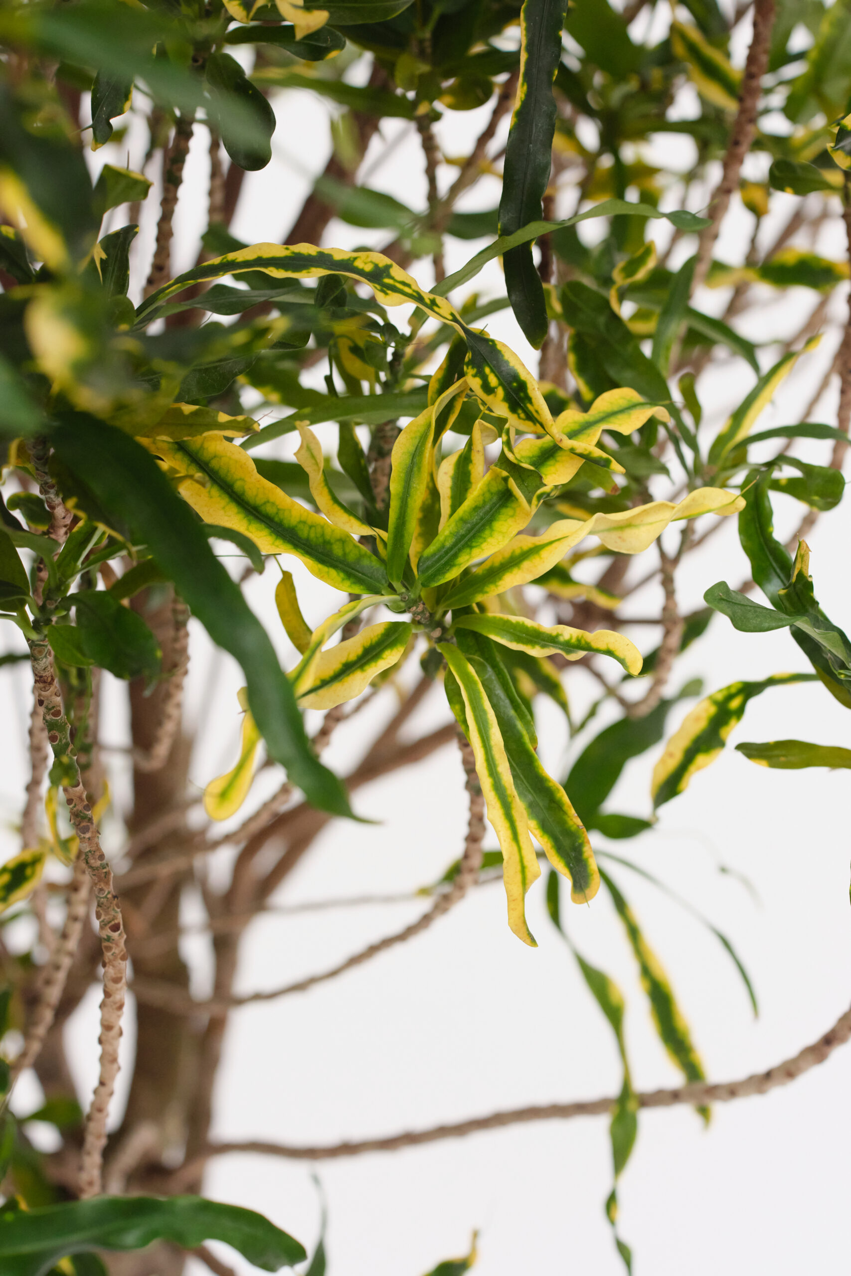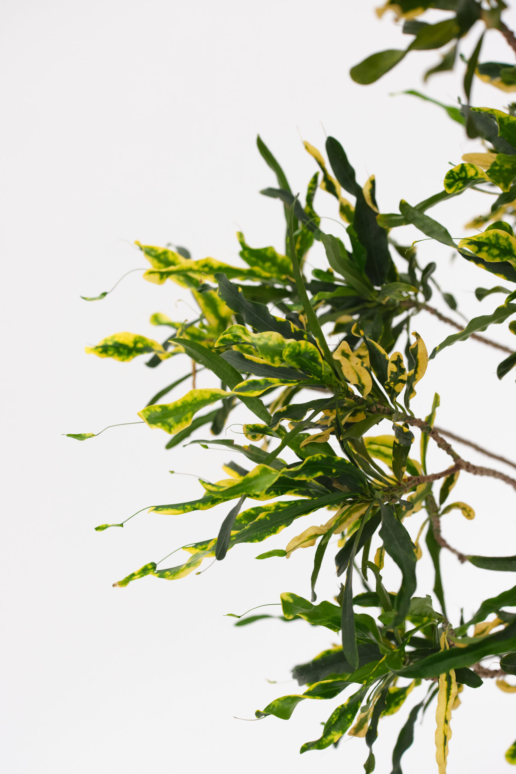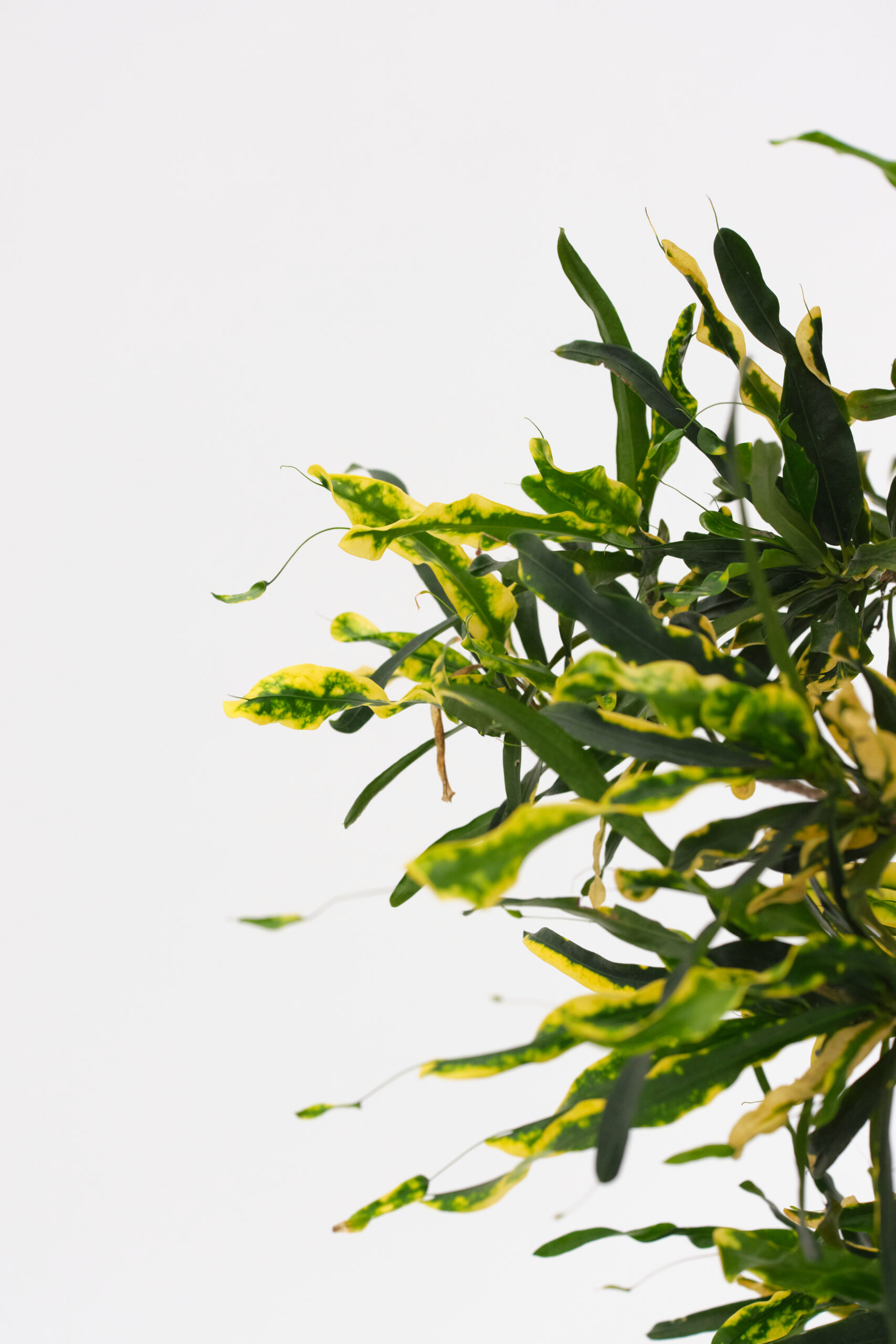 光沢のある鮮やかな葉色(黄、赤、橙など)と多様な葉の形が特徴の植物で、「変葉木」とも呼ばれます。日当たりを好みますが寒さに弱いため、冬は暖かい場所に置く必要があります。