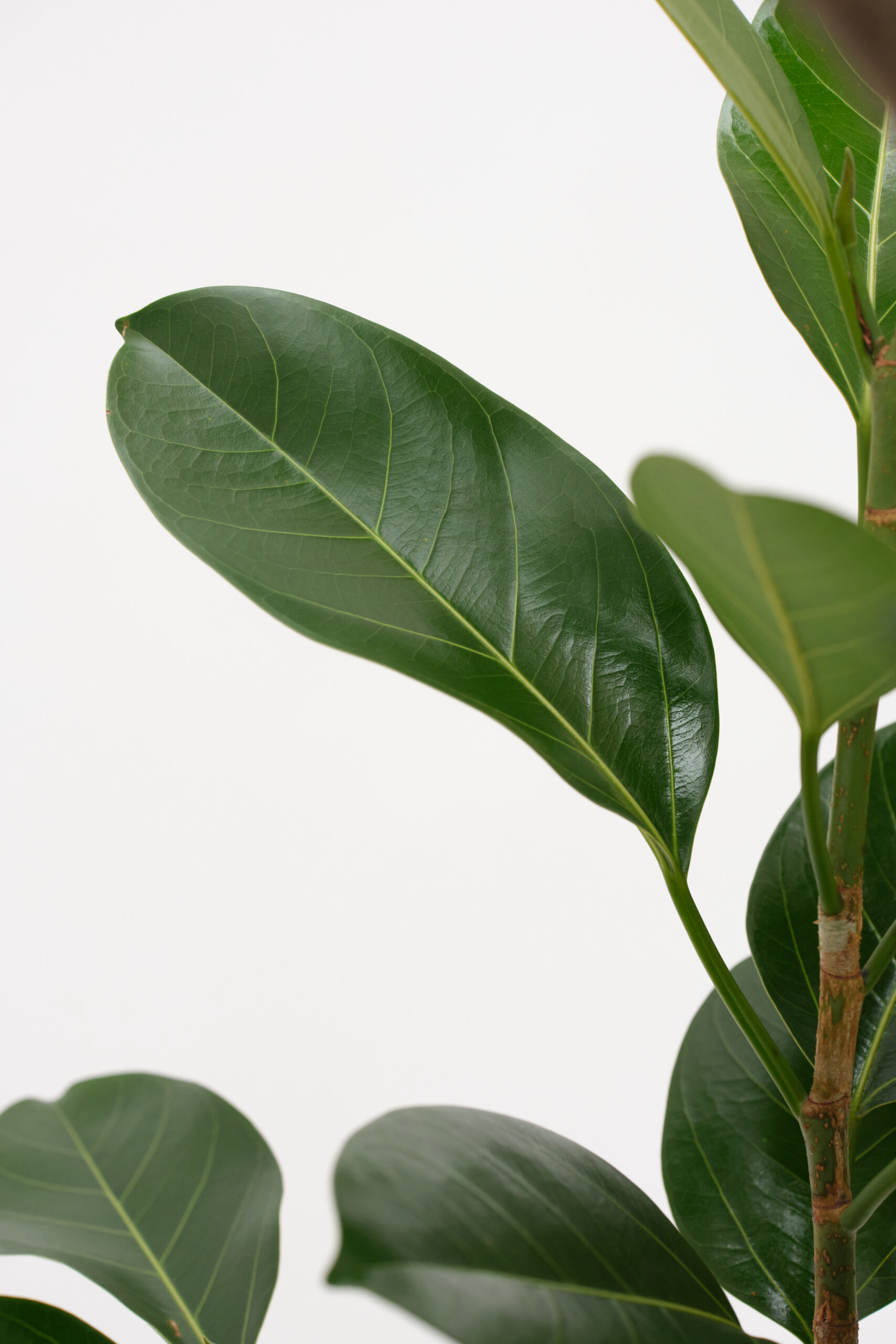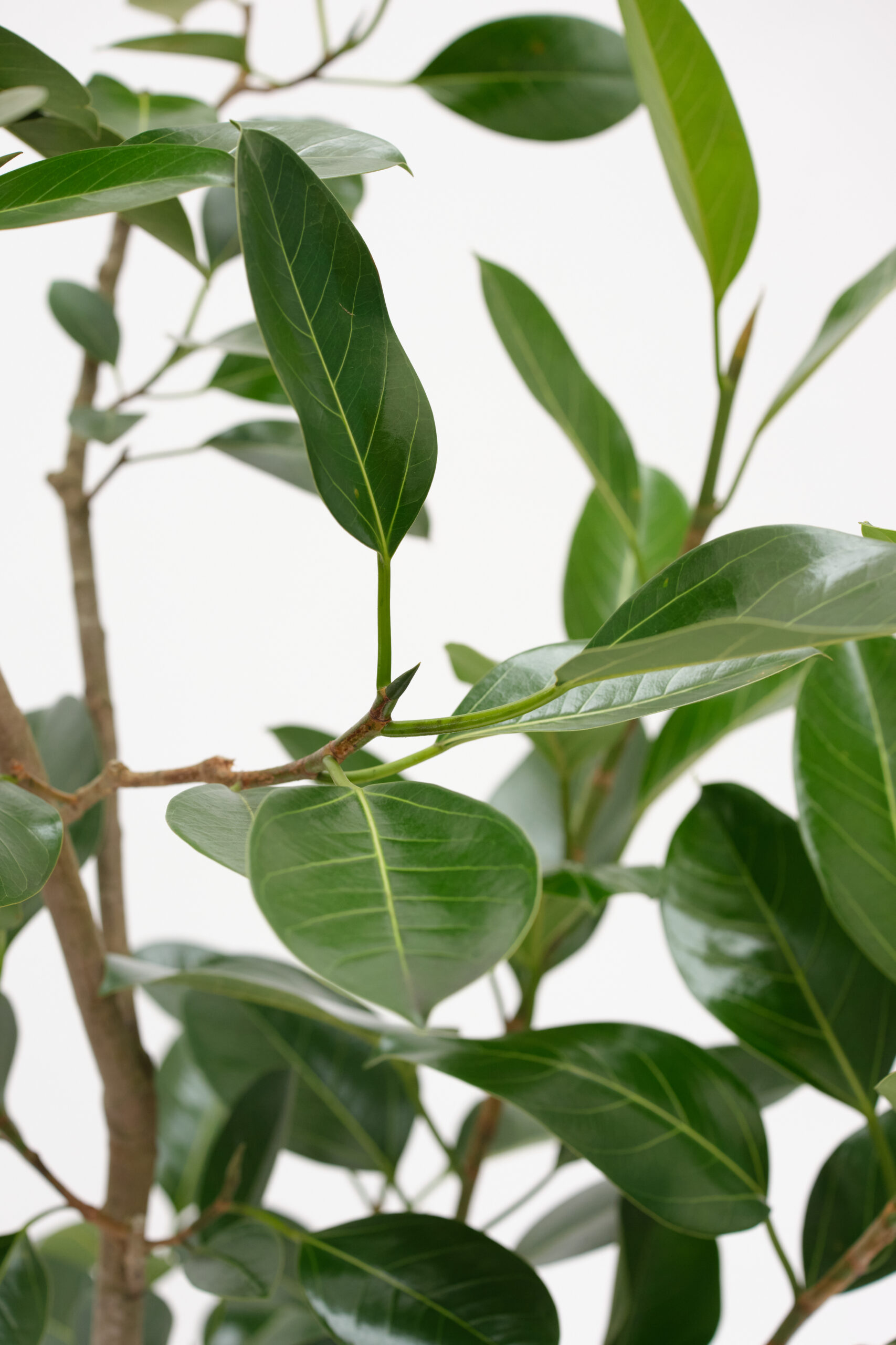 細長く艶のある濃緑色の葉が特徴です。葉の表面には、くっきりと浮き出る白っぽい葉脈が入り、葉の深い緑色との爽やかなコントラストを生み出します