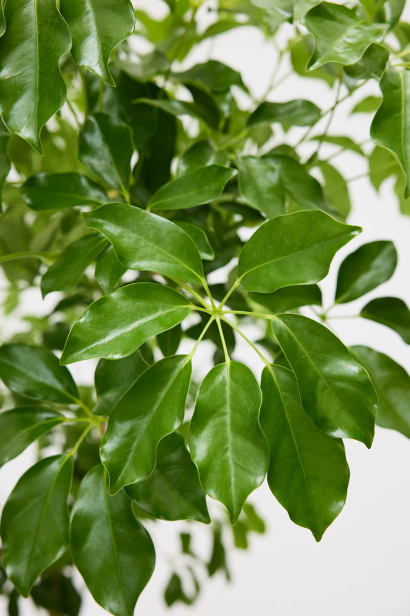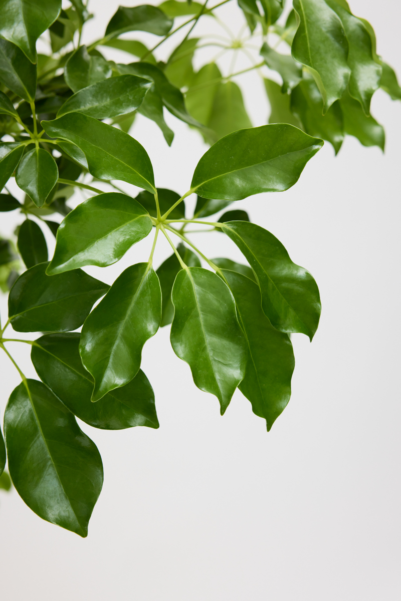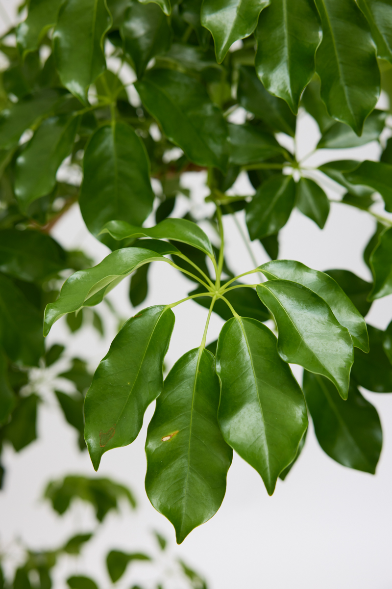 グランディーは、濃いグリーンの葉にクリーム色やイエローの斑が美しく入るシェフレラです。 葉は大きめで、縁が波打ち、ややとがった形状をしています。 葉の波打つ質感と斑入りの模様が、他のシェフレラと比べて華やかな印象を与えます。